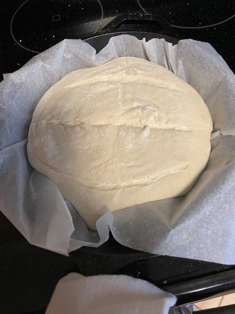When the oven and skillet are both hot boil some water (2 cups or so) and put the shaped dough into the skillet (I highly recommend putting parchment paper down and the dough on that), score it, and put it in the oven for 20 minutes. When you’ve put the dough in fill the baking pan with the boiling water (you might want to wait for the water to boil before you deal with the dough.)