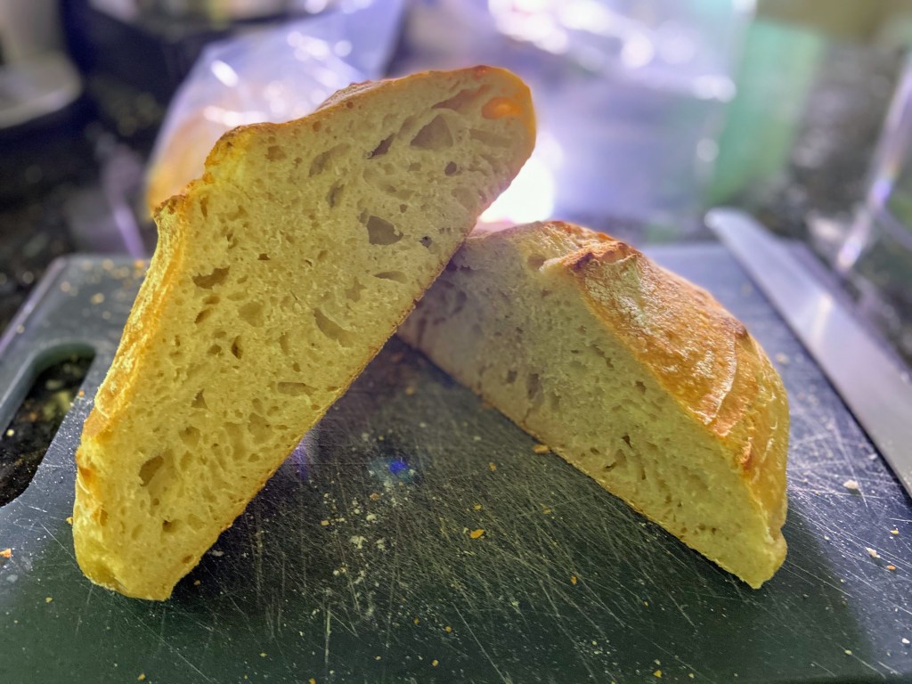 I then descended to my home-office to work while salivating over the thought of how yummy the bread would be. A few hours later I came up and cut into the bread (now fully cooled) and tried it.