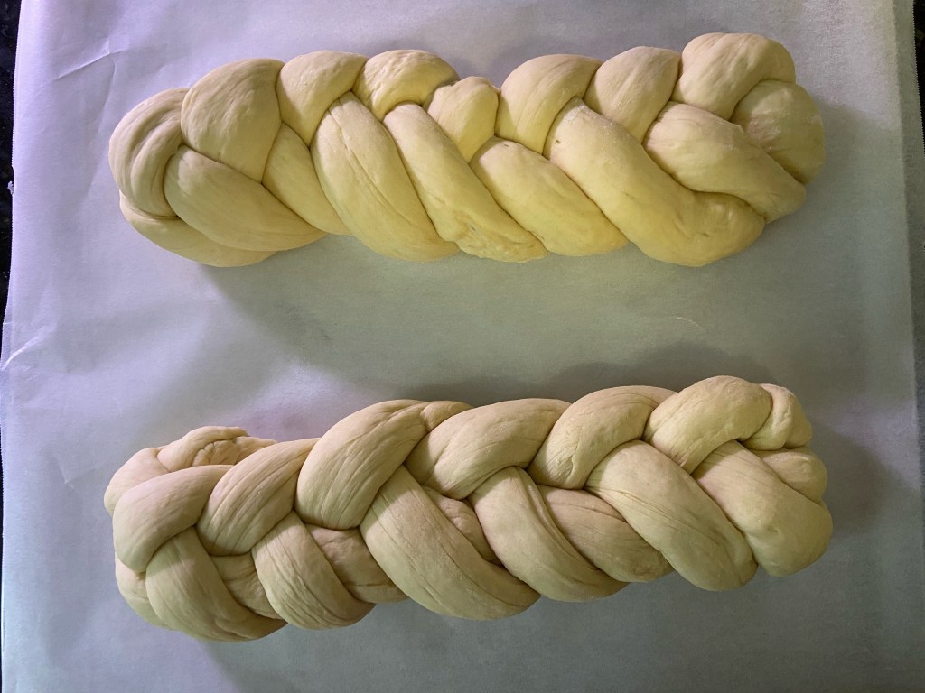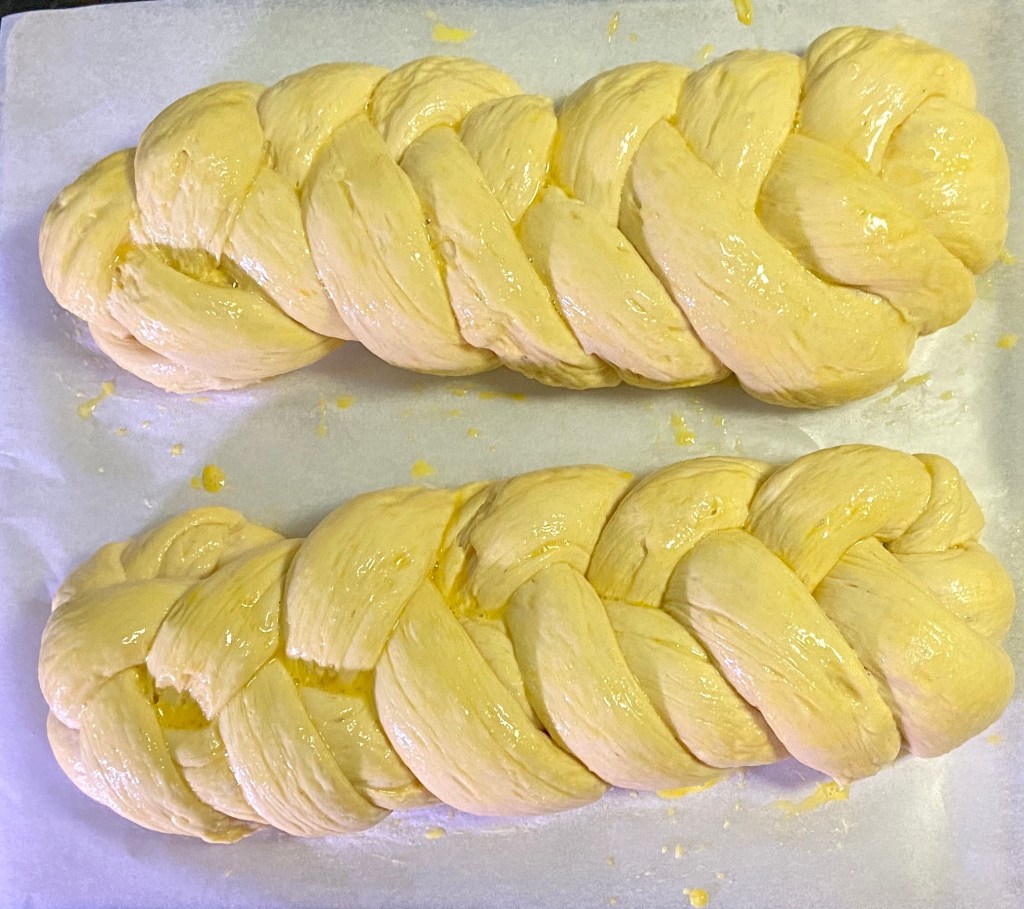 I took the dough out of the bowl and deflated it. I formed it into 8 long snakes and started to braid the challah. If you look at the picture above you can see I used 2 techniques. To be perfectly honest I’m not 100% sure which I like more but since it doesn’t affect the flavor I don’t mind trying new braiding techniques. Once they were braided I gave them an egg wash and set them to proof.