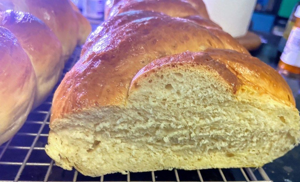 As you can see from the picture it looks like a challah should when you cut into it. When I saw how much it had grown I was half expecting huge air bubbles but thankfully it didn’t have that. I couldn’t taste the sourdough in it – not too surprising since I didn’t give it too much time – but I could tell that the starter had a huge impact on the baking. Next time, I think I’ll try cutting the yeast in half.